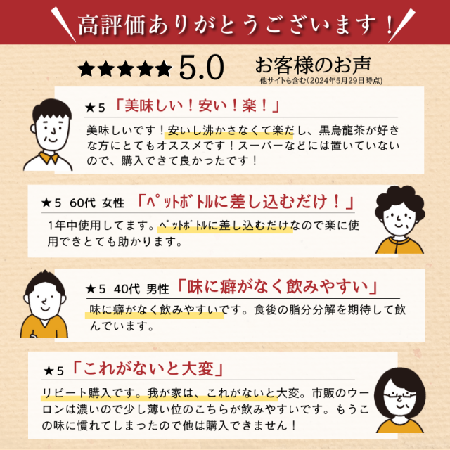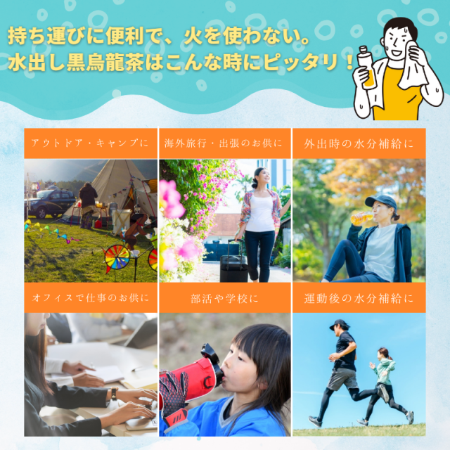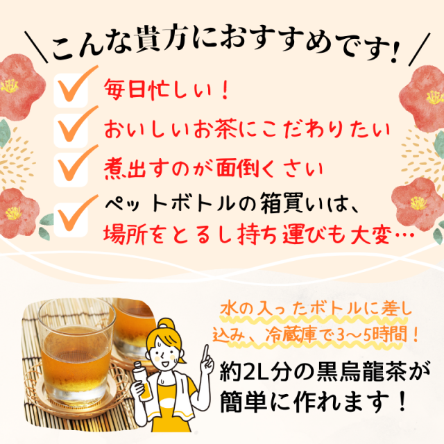 1本で2リットル分。ペットボトルに水を入れて、スティックティーパックを差し込むだけ!冷蔵庫で約3時間冷やせば香り高い黒烏龍茶の出来上がり。夏場に熱湯を作る必要がなく、ミネラルウォーター等に入れて冷蔵庫で冷やすだけで簡単においしい黒烏龍茶が出来上がります。黒烏龍茶の爽やかな風味とさっぱりとした後口が夏場の喉の渇きを潤してくれます。