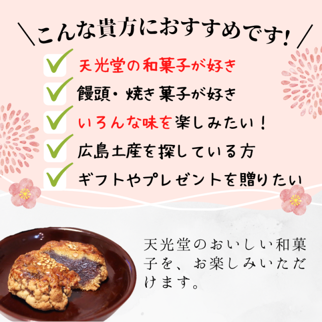 TOP 全商品 おやつ・おつまみ 広島の土産特集 父の日ギフト特集 天光堂の和菓子 6種×1個詰め合わせセット 天光堂 広島銘菓 |(4月末まで) ★受注生産商品【E113】 価格: ¥2,084 (税込) [ポイント還元 41ポイント~] 販売期間: 2025年10月01日08時00分~2026年04月30日07時59分 メーカー: 天光堂有限会社 型番: E113 手提げ袋(紙袋): 1枚まで希望可能 です。 選択してください 希望しない(¥0) 1枚希望(¥0) 数量: 個 在庫: 在庫あり 在庫 在庫あり 返品についての詳細はこちら レビューはありません 商品説明 天光堂を代表する和菓子の詰め合わせ ギフトやプレゼントにもおすすめです。 商品詳細 【天光堂 和菓子】●内容量:6個 ●原材料名:こちらからご確認ください ●賞味期限:お届けから20日間以上 ●保存方法:直射日光高温多湿不可 ●製造者:天光堂有限会社 〒730-0052 広島県広島市中区千田町3-3-12 商品仕様 製品名: 天光堂の和菓子 6種×1個詰め合わせ セット 型番: E113 メーカー: 天光堂有限会社 この商品を買った人はこんな商品にも興味を持っています 昆布茶飲み比べセット 48袋 全4種【メール便送料無料】【A055】(12) ¥1,000(税込) 数量:0123456789101112131415161718192021222324252627282930 個 【休売】熟成蒸し黒しょうがパウダー 25g【C064】【メール便送料無料】(4) ¥1,000(税込) 在庫切れ 食物繊維入り昆布茶 飲み比べセット 45袋 全3種【メール便送料無料】【A056】(12) ¥1,000(税込) 数量:0123456789101112131415161718192021222324252627282930 個 しょうが湯セット 全5種 18袋 飲み比べ【メール便送料無料】【C002】(6) ¥1,000(税込) 数量:0123456789101112131415161718192021222324252627282930 個 くず湯セット 全4種 18袋 飲み比べ 【メール便送料無料】【C003】(12) ¥1,000(税込) 数量:0123456789101112131415161718192021222324252627282930 個 【メール便送料無料】瀬戸内レモンペッパー 75g袋 粉末 スタンドパック【F001】(1.5) ¥500(税込) 数量:0123456789101112131415161718192021222324252627282930 個 さわやか 種なし干し梅 個包装 90g【メール便送料無料】【E071】(12) ¥1,000(税込) 数量:0123456789101112131415161718192021222324252627282930 個 すぐ漬けアソートA おすすめセット 19袋入り【B021】【メール便送料無料】(6) ¥1,000(税込) 数量:0123456789101112131415161718192021222324252627282930 個 【4月再販】すぐ漬けアソートB 春夏の彩セット 20袋入り【メール便送料無料】【B022】(6) ¥1,000(税込) 在庫切れ すぐ漬けアソートC 秋冬のこだわりセット 19袋入り【B023】【メール便送料無料】(6) ¥1,000(税込) 数量:0123456789101112131415161718192021222324252627282930 個 500ml ペットボトル マイボトル用 麦茶 30袋入(15袋×2個セット) 【メール便送料無料】【E007】(12) ¥700(税込) 数量:0123456789101112131415161718192021222324252627282930 個 黄金だし 8.8g×12袋 【F019】(4)【メール便送料無料】 ¥1,000(税込) 数量:0123456789101112131415161718192021222324252627282930 個 スープセット 全3種 8袋 飲み比べ【メール便送料無料】【F085】(6) ¥1,000(税込) 数量:0123456789101112131415161718192021222324252627282930 個 角切り昆布茶・梅昆布茶セット 【メール便送料無料】【A061-A062】(4) ¥1,000(税込) 数量:0123456789101112131415161718192021222324252627282930 個