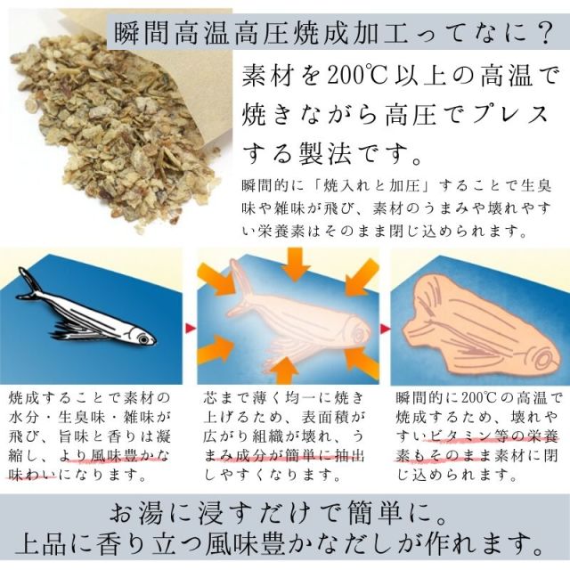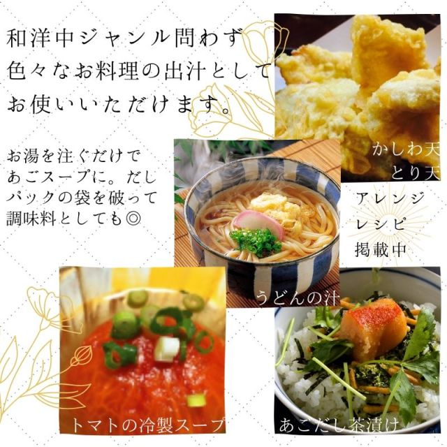 ●内容量:56g(7袋) ●栄養成分表示:[1袋8gあたり]エネルギー 16kcal/たんぱく質1.6g/脂質0g/炭水化物2.4g/食塩相当量3.9g ●原材料名:食塩(国内製造)、焼あご、砂糖、昆布、粉末醤油(大豆・小麦を含む)/調味料(アミノ酸等)、着色料(カラメル色素) ●賞味期限:製造日から12ヶ月 ●保存方法:直射日光、高温多湿を避け、常温で保存してください。●発送方法 メール便:4個まで可能